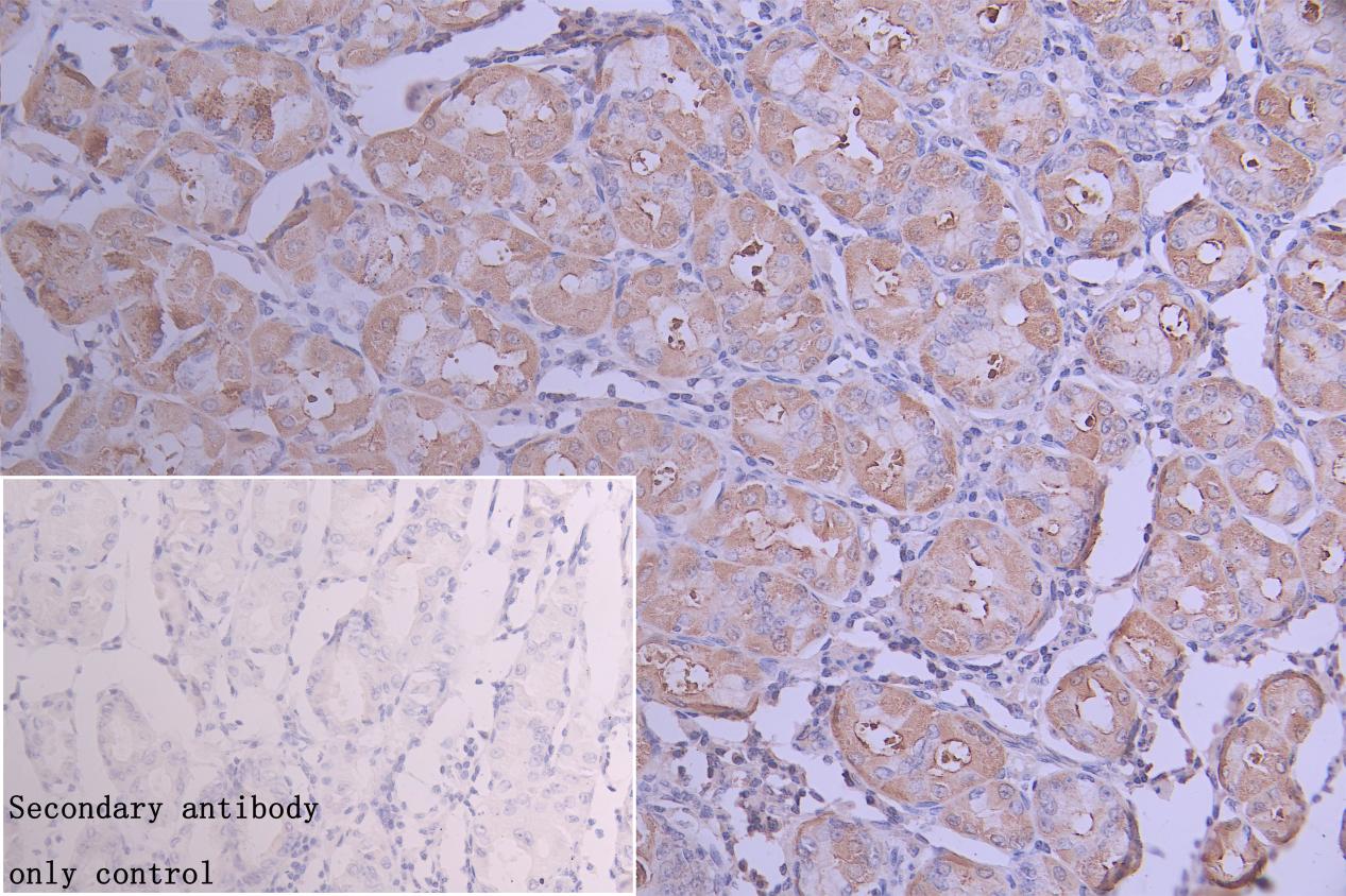 IHC image of CSB-PA887979LA01HU diluted at 1:300 and staining in paraffin-embedded human gastric tissue performed on a Leica BondTM system. After dewaxing and hydration, antigen retrieval was mediated by high pressure in a citrate buffer (pH 6.0). Section was blocked with 10% normal goat serum 30min at RT. Then primary antibody (1% BSA) was incubated at 4°C overnight. The primary is detected by a Goat anti-rabbit polymer IgG labeled by HRP and visualized using 0.05% DAB. Secondary antibody only control: uses 1% BSA instead of primary antibody