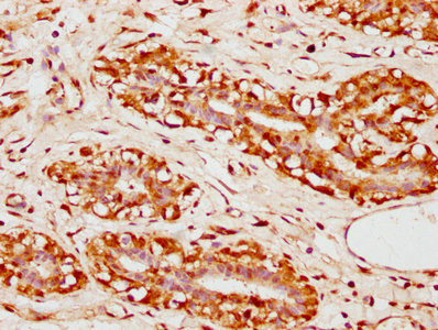 IHC image of CSB-PA837860LA01HU diluted at 1:300 and staining in paraffin-embedded human breast cancer performed on a Leica BondTM system. After dewaxing and hydration, antigen retrieval was mediated by high pressure in a citrate buffer (pH 6.0). Section was blocked with 10% normal goat serum 30min at RT. Then primary antibody (1% BSA) was incubated at 4°C overnight. The primary is detected by a biotinylated secondary antibody and visualized using an HRP conjugated SP system.