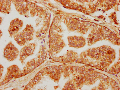 IHC image of CSB-PA837860LA01HU diluted at 1:300 and staining in paraffin-embedded human prostate cancer performed on a Leica BondTM system. After dewaxing and hydration, antigen retrieval was mediated by high pressure in a citrate buffer (pH 6.0). Section was blocked with 10% normal goat serum 30min at RT. Then primary antibody (1% BSA) was incubated at 4°C overnight. The primary is detected by a biotinylated secondary antibody and visualized using an HRP conjugated SP system.
