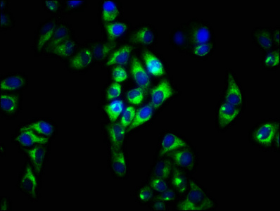 Immunofluorescence staining of Hela cells with CSB-PA853475LA01HU at 1:33, counter-stained with DAPI. The cells were fixed in 4% formaldehyde, permeabilized using 0.2% Triton X-100 and blocked in 10% normal Goat Serum. The cells were then incubated with the antibody overnight at 4°C. The secondary antibody was Alexa Fluor 488-congugated AffiniPure Goat Anti-Rabbit IgG(H+L).