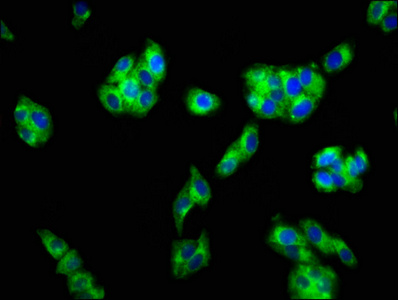 • Immunofluorescence staining of HepG2 cells with CSB-PA008604LA01HU at 1:133, counter-stained with DAPI. The cells were fixed in 4% formaldehyde, permeabilized using 0.2% Triton X-100 and blocked in 10% normal Goat Serum. The cells were then incubated with the antibody overnight at 4°C. The secondary antibody was Alexa Fluor 488-congugated AffiniPure Goat Anti-Rabbit IgG(H+L).