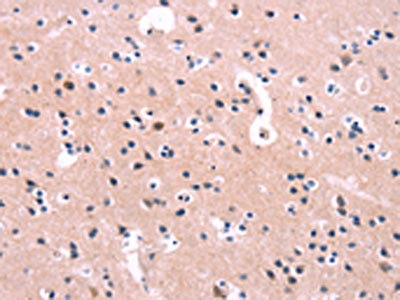 The image on the left is immunohistochemistry of paraffin-embedded Human brain tissue using CSB-PA299070(FGF16 Antibody) at dilution 1/30, on the right is treated with synthetic peptide. (Original magnification: ×200)
