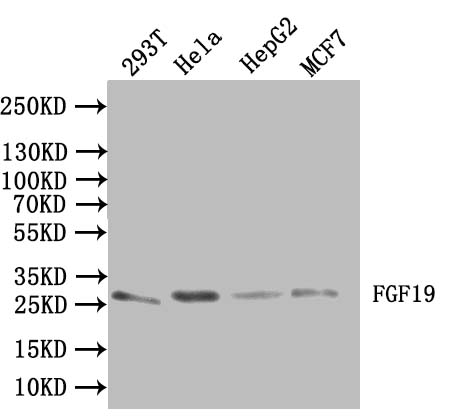 The rabbit anti-human FGF19 polyclonal antibody is an IgG antibody yielded in rabbits through immunization with the recombinant human FGF19 protein (25-216aa). It was subjected to antigen affinity purification.