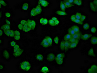 Immunofluorescence staining of HepG2 cells with CSB-PA008648LA01HU at 1:100, counter-stained with DAPI. The cells were fixed in 4% formaldehyde, permeabilized using 0.2% Triton X-100 and blocked in 10% normal Goat Serum. The cells were then incubated with the antibody overnight at 4°C. The secondary antibody was Alexa Fluor 488-congugated AffiniPure Goat Anti-Rabbit IgG(H+L).