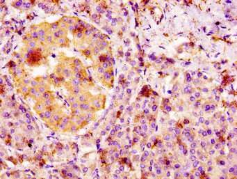 IHC image of CSB-PA008648LA01HU diluted at 1:100 and staining in paraffin-embedded human pancreatic tissue performed on a Leica BondTM system. After dewaxing and hydration, antigen retrieval was mediated by high pressure in a citrate buffer (pH 6.0). Section was blocked with 10% normal goat serum 30min at RT. Then primary antibody (1% BSA) was incubated at 4°C overnight. The primary is detected by a biotinylated secondary antibody and visualized using an HRP conjugated SP system.