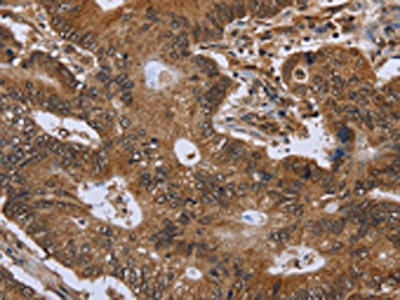 The image on the left is immunohistochemistry of paraffin-embedded Human colon cancer tissue using CSB-PA182810(FHIT Antibody) at dilution 1/30, on the right is treated with fusion protein. (Original magnification: ×200)