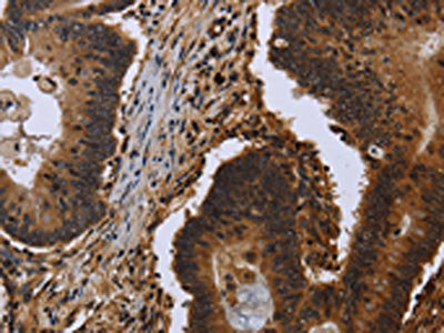 The image on the left is immunohistochemistry of paraffin-embedded Human colon cancer tissue using CSB-PA985521(FHL3 Antibody) at dilution 1/40, on the right is treated with fusion protein. (Original magnification: ×200)