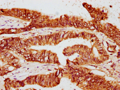 IHC image of CSB-PA008700EA01HU diluted at 1:400 and staining in paraffin-embedded human colon cancer performed on a Leica BondTM system. After dewaxing and hydration, antigen retrieval was mediated by high pressure in a citrate buffer (pH 6.0). Section was blocked with 10% normal goat serum 30min at RT. Then primary antibody (1% BSA) was incubated at 4°C overnight. The primary is detected by a biotinylated secondary antibody and visualized using an HRP conjugated SP system.