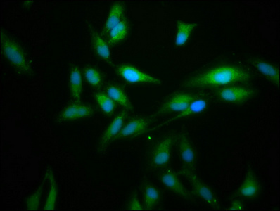 Immunofluorescence staining of Hela cells with CSB-PA615661LA01HU at 1:166, counter-stained with DAPI. The cells were fixed in 4% formaldehyde, permeabilized using 0.2% Triton X-100 and blocked in 10% normal Goat Serum. The cells were then incubated with the antibody overnight at 4°C. The secondary antibody was Alexa Fluor 488-congugated AffiniPure Goat Anti-Rabbit IgG(H+L).