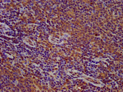 IHC image of CSB-PA615661LA01HU diluted at 1:500 and staining in paraffin-embedded human lymph node tissue performed on a Leica BondTM system. After dewaxing and hydration, antigen retrieval was mediated by high pressure in a citrate buffer (pH 6.0). Section was blocked with 10% normal goat serum 30min at RT. Then primary antibody (1% BSA) was incubated at 4°C overnight. The primary is detected by a biotinylated secondary antibody and visualized using an HRP conjugated SP system.