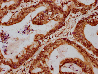 • IHC image of CSB-PA008796LA01HU diluted at 1:700 and staining in paraffin-embedded human colon cancer performed on a Leica BondTM system. After dewaxing and hydration, antigen retrieval was mediated by high pressure in a citrate buffer (pH 6.0). Section was blocked with 10% normal goat serum 30min at RT. Then primary antibody (1% BSA) was incubated at 4°C overnight. The primary is detected by a biotinylated secondary antibody and visualized using an HRP conjugated SP system.