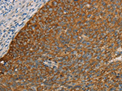 The image on the left is immunohistochemistry of paraffin-embedded Human cervical cancer tissue using CSB-PA027320(FOXF2 Antibody) at dilution 1/30, on the right is treated with synthetic peptide. (Original magnification: ×200)