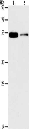 Gel: 8%SDS-PAGE, Lysate: 40 μg, Lane 1-2: Human placenta tissue, human normal liver tissue, Primary antibody: CSB-PA027320(FOXF2 Antibody) at dilution 1/666, Secondary antibody: Goat anti rabbit IgG at 1/8000 dilution, Exposure time: 5 minutes