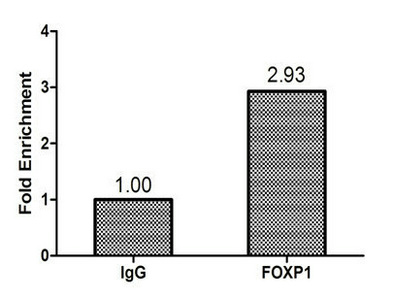 Chromatin Immunoprecipitation Hela (1.1*106) were cross-linked with formaldehyde, sonicated, and immunoprecipitated with 4μg anti-FOXP1 or a control normal rabbit IgG. The resulting ChIP DNA was quantified using real-time PCR with primers (CSB-PP008841HU) against the HSP90B promoter.