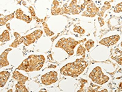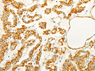 The image on the left is immunohistochemistry of paraffin-embedded Human thyroid cancer tissue using CSB-PA215116(FOXR2 Antibody) at dilution 1/25, on the right is treated with fusion protein. (Original magnification: ×200)