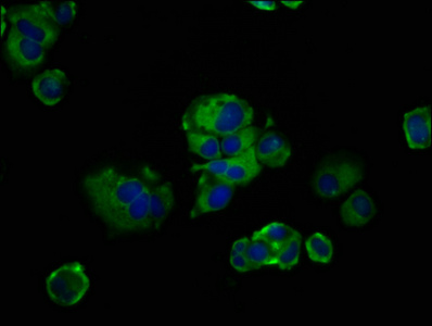 Immunofluorescence staining of MCF-7 cells with CSB-PA722558LA01HU at 1:133, counter-stained with DAPI. The cells were fixed in 4% formaldehyde, permeabilized using 0.2% Triton X-100 and blocked in 10% normal Goat Serum. The cells were then incubated with the antibody overnight at 4°C. The secondary antibody was Alexa Fluor 488-congugated AffiniPure Goat Anti-Rabbit IgG(H+L).