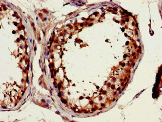 Immunohistochemistry of paraffin-embedded human testis tissue using CSB-PA619084LA01HU at dilution of 1:100