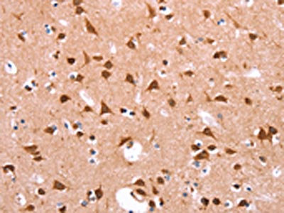 The image on the left is immunohistochemistry of paraffin-embedded Human brain tissue using CSB-PA557036(FUT8 Antibody) at dilution 1/20, on the right is treated with synthetic peptide. (Original magnification: ×200)