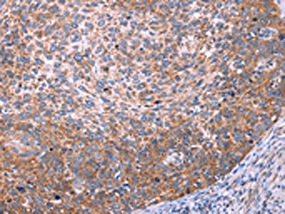 The image on the left is immunohistochemistry of paraffin-embedded Human cervical cancer tissue using CSB-PA557036(FUT8 Antibody) at dilution 1/20, on the right is treated with synthetic peptide. (Original magnification: ×200)