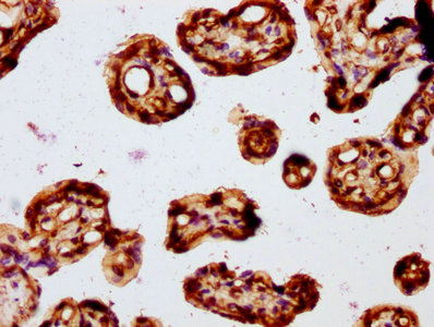 • IHC image of CSB-PA882067ESR1HU diluted at 1:194 and staining in paraffin-embedded human placenta tissue performed on a Leica BondTM system. After dewaxing and hydration, antigen retrieval was mediated by high pressure in a citrate buffer (pH 6.0). Section was blocked with 10% normal goat serum 30min at RT. Then primary antibody (1% BSA) was incubated at 4°C overnight. The primary is detected by a biotinylated secondary antibody and visualized using an HRP conjugated SP system.