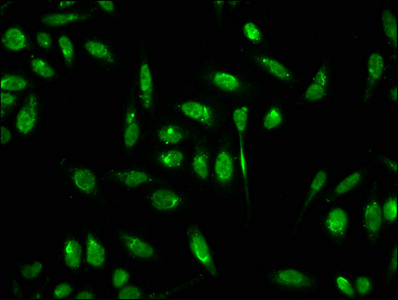 • Immunofluorescence staining of Hela cells with CSB-PA010418OA18forHU at 1:7.5, counter-stained with DAPI. The cells were fixed in 4% formaldehyde, permeabilized using 0.2% Triton X-100 and blocked in 10% normal Goat Serum. The cells were then incubated with the antibody overnight at 4°C. The secondary antibody was Alexa Fluor 488-congugated AffiniPure Goat Anti-Rabbit IgG(H+L).