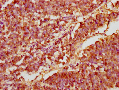 IHC image of CSB-PA837451LA01HU diluted at 1:200 and staining in paraffin-embedded human lung cancer performed on a Leica BondTM system. After dewaxing and hydration, antigen retrieval was mediated by high pressure in a citrate buffer (pH 6.0). Section was blocked with 10% normal goat serum 30min at RT. Then primary antibody (1% BSA) was incubated at 4°C overnight. The primary is detected by a biotinylated secondary antibody and visualized using an HRP conjugated SP system.
