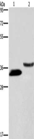 Gel: 8%SDS-PAGE, Lysate: 40 μg, Lane 1-2: 293T cells, human kidney tissue, Primary antibody: CSB-PA063689(GAS1 Antibody) at dilution 1/100, Secondary antibody: Goat anti rabbit IgG at 1/8000 dilution, Exposure time: 3 minutes