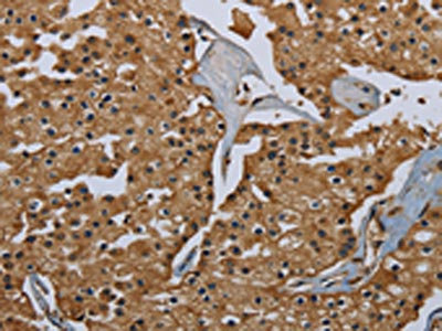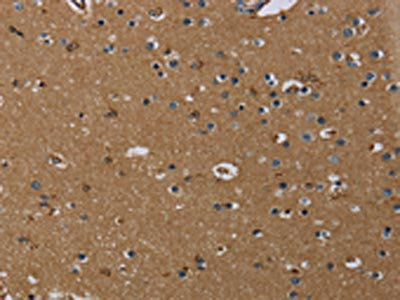 The image on the left is immunohistochemistry of paraffin-embedded Human brain tissue using CSB-PA977537(GBP5 Antibody) at dilution 1/40, on the right is treated with fusion protein. (Original magnification: ×200)