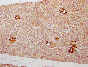 IHC image of CSB-PA009315LA01HU diluted at 1:300 and staining in paraffin-embedded human pancreatic tissue performed on a Leica BondTM system. After dewaxing and hydration, antigen retrieval was mediated by high pressure in a citrate buffer (pH 6.0). Section was blocked with 10% normal goat serum 30min at RT. Then primary antibody (1% BSA) was incubated at 4°C overnight. The primary is detected by a Goat anti-rabbit polymer IgG labeled by HRP and visualized using 0.05% DAB.