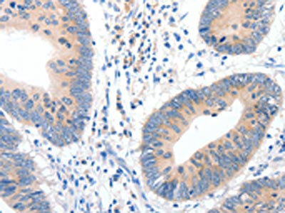 The image on the left is immunohistochemistry of paraffin-embedded Human colon cancer tissue using CSB-PA594444(GCK Antibody) at dilution 1/20, on the right is treated with synthetic peptide. (Original magnification: ×200)