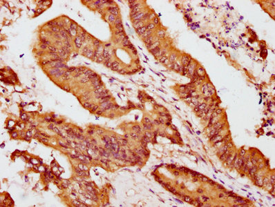 • IHC image of CSB-PA009321LA01HU diluted at 1:100 and staining in paraffin-embedded human colon cancer performed on a Leica BondTM system. After dewaxing and hydration, antigen retrieval was mediated by high pressure in a citrate buffer (pH 6.0). Section was blocked with 10% normal goat serum 30min at RT. Then primary antibody (1% BSA) was incubated at 4°C overnight. The primary is detected by a biotinylated secondary antibody and visualized using an HRP conjugated SP system.