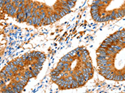 • The image on the left is immunohistochemistry of paraffin-embedded Human colon cancer tissue using CSB-PA245851(GDF6 Antibody) at dilution 1/20, on the right is treated with synthetic peptide. (Original magnification: ×200)