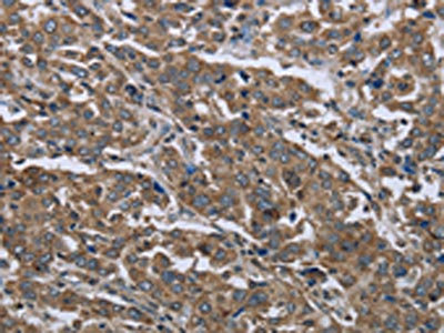 The image on the left is immunohistochemistry of paraffin-embedded Human liver cancer tissue using CSB-PA962996(GGCX Antibody) at dilution 1/50, on the right is treated with fusion protein. (Original magnification: ×200)