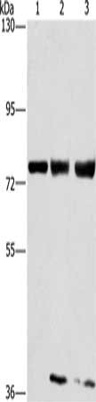 Gel: 6%SDS-PAGE, Lysate: 40 μg, Lane 1-3: MCF7 cells, hela cells, 293T cells, Primary antibody: CSB-PA962996(GGCX Antibody) at dilution 1/400, Secondary antibody: Goat anti rabbit IgG at 1/8000 dilution, Exposure time: 40 seconds