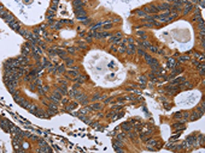 • The image on the left is immunohistochemistry of paraffin-embedded Human colon cancer tissue using CSB-PA902740(GH2 Antibody) at dilution 1/40, on the right is treated with fusion protein. (Original magnification: ×200)