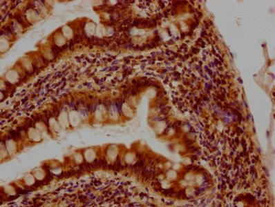 • IHC image of CSB-PA009434PA01HU diluted at 1:400 and staining in paraffin-embedded human small intestine tissue performed on a Leica BondTM system. After dewaxing and hydration, antigen retrieval was mediated by high pressure in a citrate buffer (pH 6.0). Section was blocked with 10% normal goat serum 30min at RT. Then primary antibody (1% BSA) was incubated at 4°C overnight. The primary is detected by a biotinylated secondary antibody and visualized using an HRP conjugated SP system.