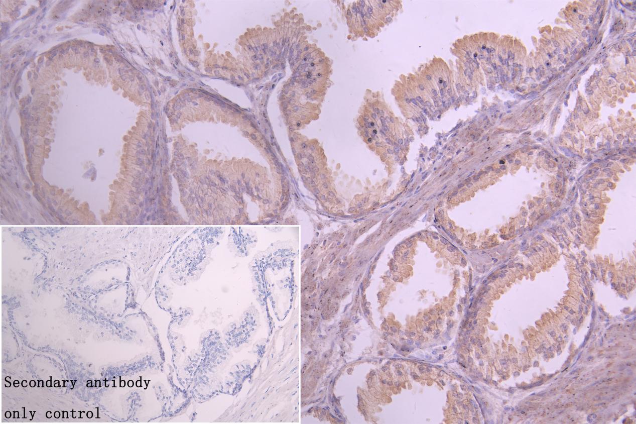 IHC image of CSB-PA009438ESR1HU diluted at 1:100 and staining in paraffin-embedded human prostate cancer performed on a Leica BondTM system. After dewaxing and hydration, antigen retrieval was mediated by high pressure in a citrate buffer (pH 6.0). Section was blocked with 10% normal goat serum 30min at RT. Then primary antibody (1% BSA) was incubated at 4°C overnight. The primary is detected by a Goat anti-rabbit polymer IgG labeled by HRP and visualized using 0.05% DAB. Secondary antibody only control: uses 1% BSA instead of primary antibody