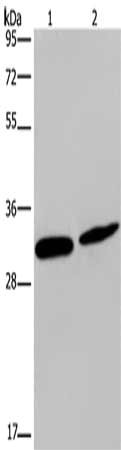 Gel: 10%SDS-PAGE, Lysate: 40 μg, Lane 1-2: Mouse skin tissue, Hela cells, Primary antibody: CSB-PA558294(GJB4 Antibody) at dilution 1/200, Secondary antibody: Goat anti rabbit IgG at 1/8000 dilution, Exposure time: 5 minutes