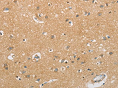 • The image on the left is immunohistochemistry of paraffin-embedded Human brain tissue using CSB-PA551964(GJB6 Antibody) at dilution 1/60, on the right is treated with synthetic peptide. (Original magnification: ×200)
