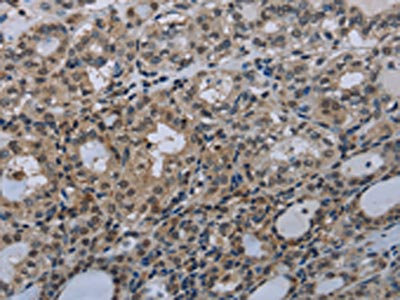 • The image on the left is immunohistochemistry of paraffin-embedded Human thyroid cancer tissue using CSB-PA065045(GJC2 Antibody) at dilution 1/40, on the right is treated with synthetic peptide. (Original magnification: ×200)