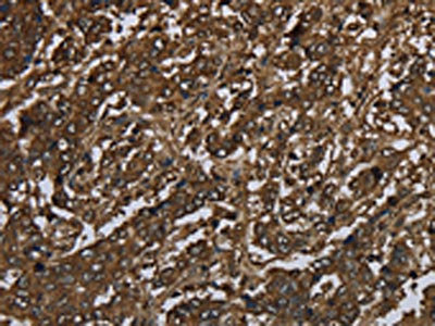 The image on the left is immunohistochemistry of paraffin-embedded Human liver cancer tissue using CSB-PA829442(GLO1 Antibody) at dilution 1/60, on the right is treated with fusion protein. (Original magnification: ×200)