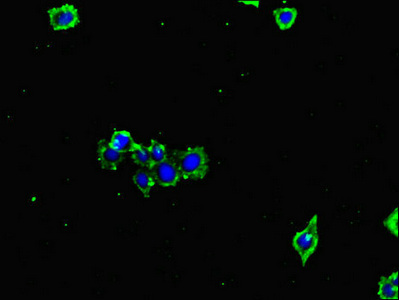 • Immunofluorescent analysis of HepG2 cells using CSB-PA009553LA01HU at dilution of 1:100 and Alexa Fluor 488-congugated AffiniPure Goat Anti-Rabbit IgG(H+L)