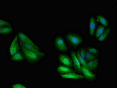 • Immunofluorescent analysis of HepG2 cells using CSB-PA009602LA01HU at dilution of 1:100 and Alexa Fluor 488-congugated AffiniPure Goat Anti-Rabbit IgG(H+L)