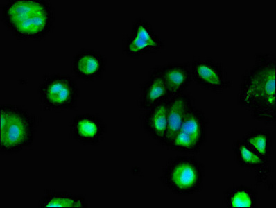 Immunofluorescent analysis of MCF-7 cells using CSB-PA859933LA01HU at dilution of 1:100 and Alexa Fluor 488-congugated AffiniPure Goat Anti-Rabbit IgG(H+L)