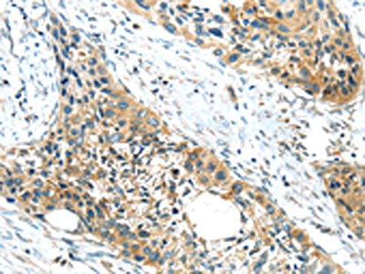 The image on the left is immunohistochemistry of paraffin-embedded Human esophagus cancer tissue using CSB-PA137931(GPR15 Antibody) at dilution 1/20, on the right is treated with synthetic peptide. (Original magnification: ×200)