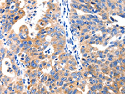 The image on the left is immunohistochemistry of paraffin-embedded Human colon cancer tissue using CSB-PA559950(GRM1 Antibody) at dilution 1/10, on the right is treated with synthetic peptide. (Original magnification: ×200)