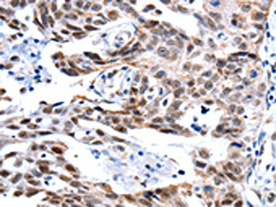 The image on the left is immunohistochemistry of paraffin-embedded Human colon cancer tissue using CSB-PA147596(GSK3A Antibody) at dilution 1/50, on the right is treated with synthetic peptide. (Original magnification: ×200)