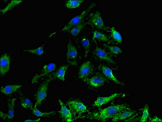 • Immunofluorescent analysis of Hela cells using CSB-PA009963LA01HU at dilution of 1:100 and Alexa Fluor 488-congugated AffiniPure Goat Anti-Rabbit IgG(H+L)