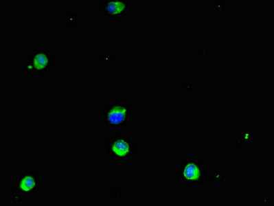 Immunofluorescent analysis of Hela cells using CSB-PA009979LA01HU at dilution of 1:100 and Alexa Fluor 488-congugated AffiniPure Goat Anti-Rabbit IgG(H+L)