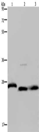Gel: 8%SDS-PAGE, Lysate: 40 μg, Lane 1-3: Human placenta tissue, HT29 cells, human fetal brain tissue, Primary antibody: CSB-PA949648(GSTP1 Antibody) at dilution 1/300, Secondary antibody: Goat anti rabbit IgG at 1/8000 dilution, Exposure time: 10 seconds